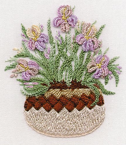 Gorgeous petals of Knotted Cast-on stitches and long pistils of Bullion stitches produce this stunning piece of needlework. Designs are 4" tall. |