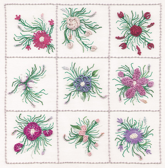 Violet, Peach Blossom, Creeping Flower, Geron Daisy, Rolled Rose, Cast-on Flower, Bullion Rose, Bouclé Rose, and Knotted Lazy Daisy.